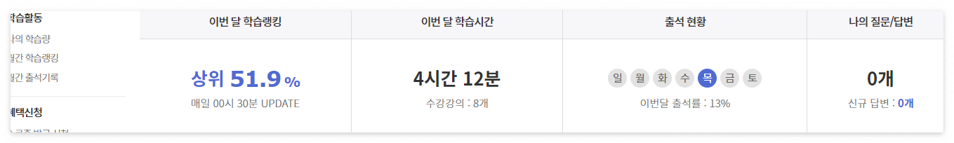 에듀윌의 경우 강의 들은 시간을 학습 시간에 상정하여 이를 기반으로 랭킹 및 출석, 질문/답변 갯수를 지표화하여 제공합니다.